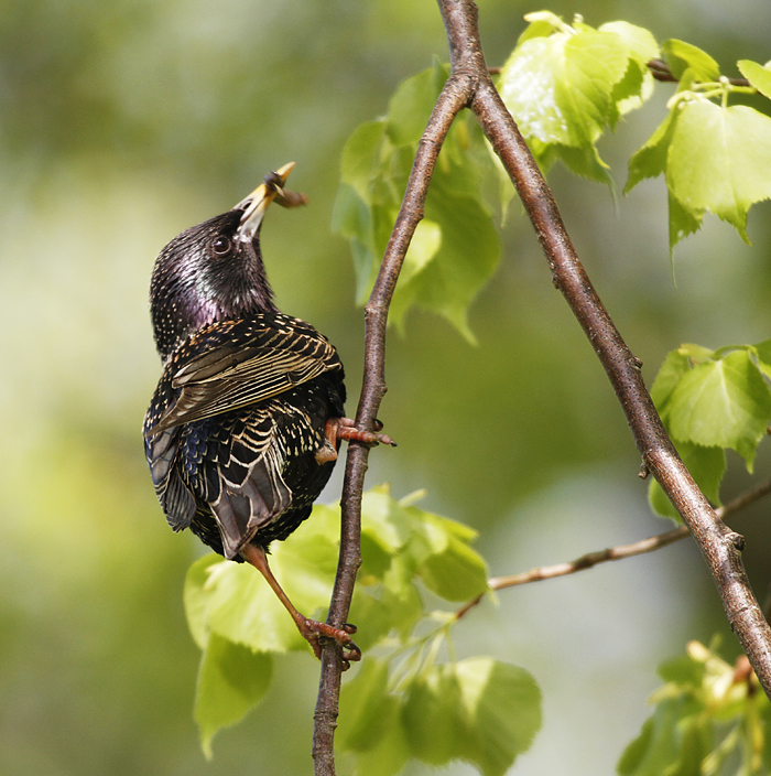 Av mina drygt 80 fågelholkar är cirka 15 ämnade för starar. I år satte jag upp två nya fräscha. Ingen av de gamla starholkarna är bebodda... av någon anledning är det ont om starar... Men i en av de nyuppsatta blev det inflyttning strax efter att jag klivit ner från stegen. Det lustiga i sammanhanget är att det är den holk som sitter mest utsatt för störning... i den stora linden endast sju meter från min farstudörr!